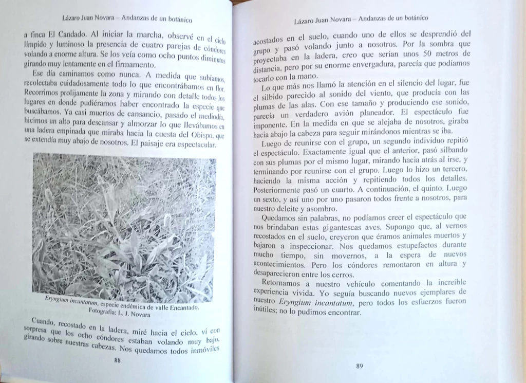 "Podría decirse, estimado lector, que en las páginas de este libro usted encontrará los entretelones de una historia de amor. Y como en cualquiera de esas historias, hay aquí momentos de dudas, de cuestionamientos, de hallazos insospechados, de zozobra y de preocupaciones; pero también, y sobre los hay de gratitud, de entusiasmo, de paz, de risas y de alegría. Créame que no exagero. Porque solo el verdadero amor hacia algo puede mover a alguien a consagrarle la vida, todas sus horas de trabajo, gran cantidad de las de ocio, muchos pensamientos antes de dormir y hasta parte de los sueños. Esta que usted tiene en sus manos es la historia del amor de un botánico, Lázaro Juan Novara, por las plantas de Salta."